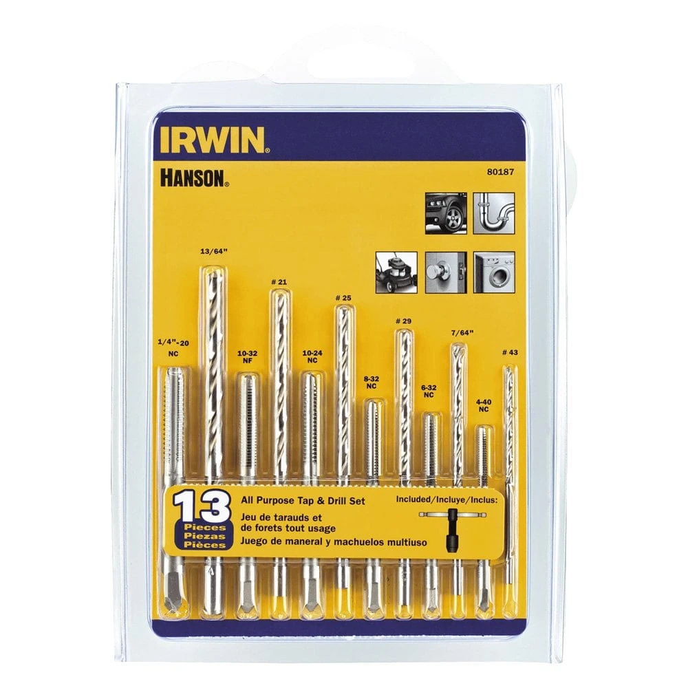 Hanson™ 13-Piece All-Purpose Tap/Drill Bit Set by IRWIN®. Tap – HCS, Drill Bit- HSS. This product is made of high-quality materials to serve you for years to come. Designed using state-of-the-art technology and with customers in mind, this product by IRWIN® will last a lifetime. It will meet your needs and deliver great quality at an affordable cost.